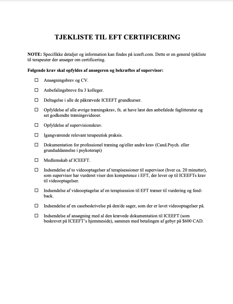 Certification materials typically include a case description and two video clips of about 20 minutes each that demonstrate your grasp of EFT interventions and therapist presence.